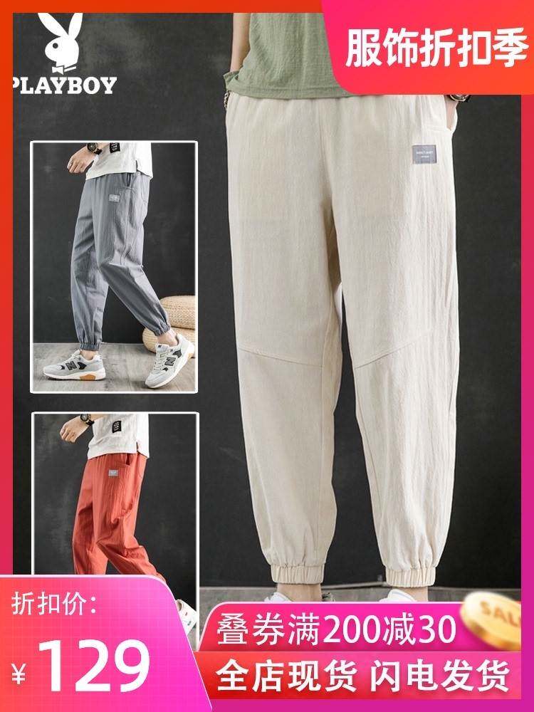 花花公子亚麻九分裤男潮流牌夏季薄款工装棉麻束脚宽松休闲长裤子热门设计联盟服务商
